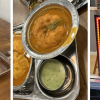 Steamed rice and lentil cakes, fried lentil donut and served with chutney and sambar