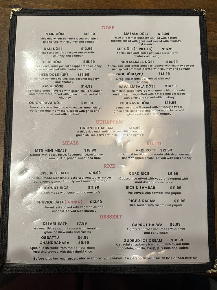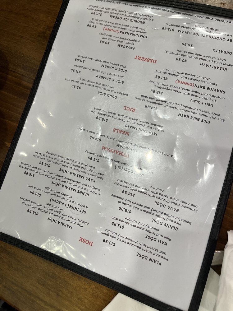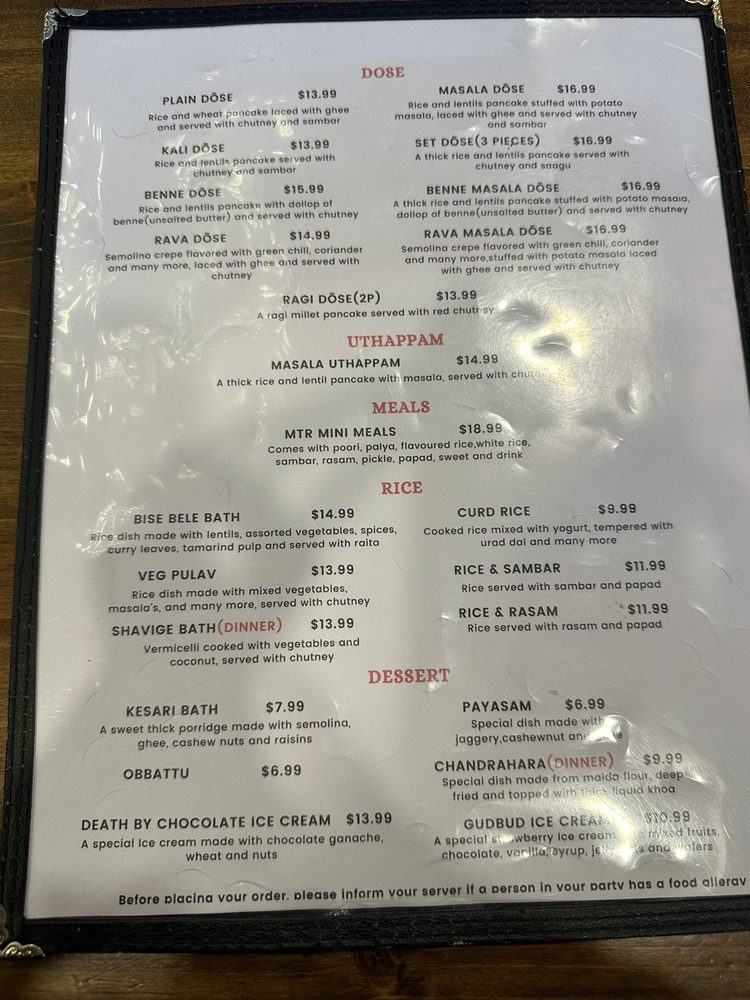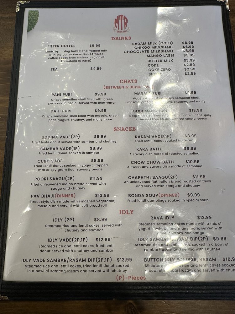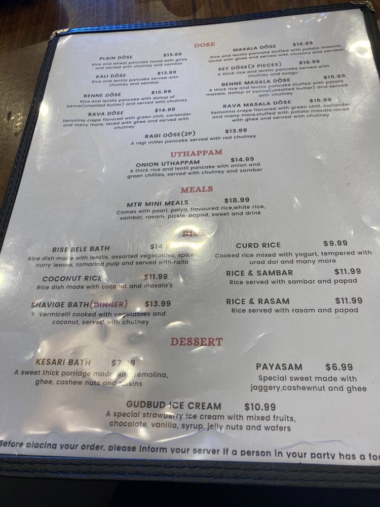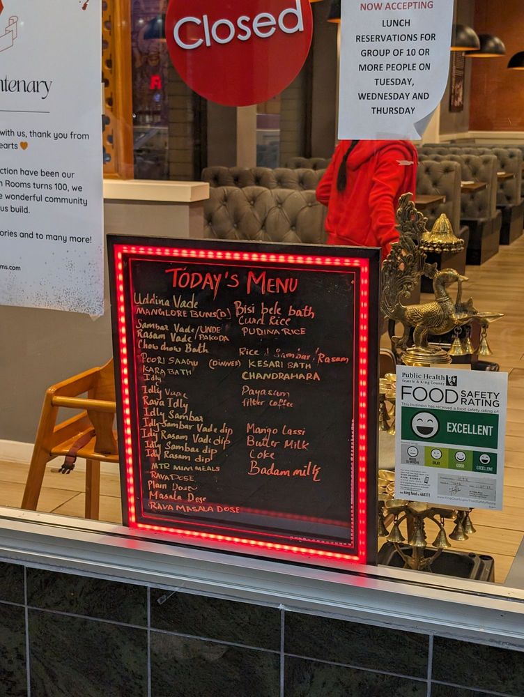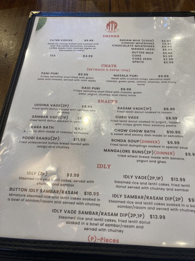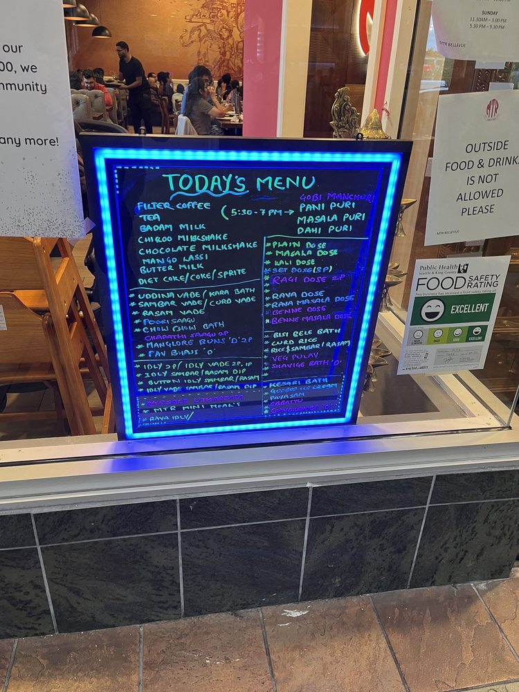 Introducing the menu at MTR - Mavalli Tiffin, a renowned vegetarian Indian comfort food spot in Bellevue, WA. This restaurant offers authentic South Indian cuisine with a focus on dosas, idlis, vadas, and more. Customers rave about the Rava Idli and Masala Dosa, highlighting the perfect blend of flavors and textures. The Mangalore Buns are a must-try for their delicate sweetness paired with velvety coconut curry. Service is prompt, and the ambiance brings a taste of India to the dining experience. While prices may be slightly higher, the quality of the food is undeniably worth it for enthusiasts of South Indian cuisine. With vegan options and a welcoming staff, MTR - Mavalli Tiffin promises an unforgettable culinary journey through Bangalore's traditional flavors.